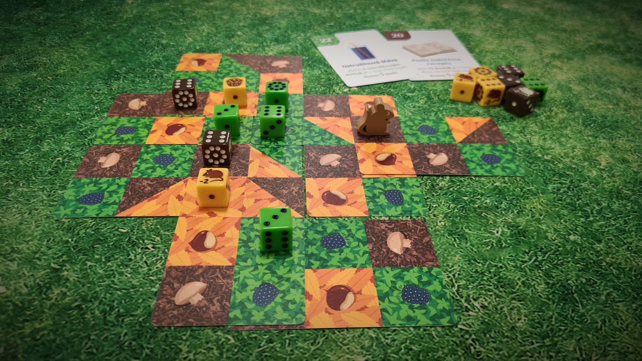 Takové je téma podzimně laděné hry, kterou jsme si mohli vyzkoušet. Dary lesa je karetní rychlovka pro jednoho hráče, v níž je vaším úkolem naplnit košík nasbíranými houbami, ostružinami a jedlými kaštany. Přijde vám to povědomé? Dary lesa je poslední díl trilogie sólových her Orchard a Citrusy (Citrusy můžete znát i díky české verzi od vydavatelství TLAMA games).